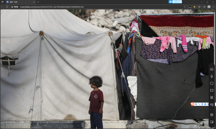 10月5日,在加沙地带中部,一名儿童站在难民营的帐篷前。联合国儿童基金会发言人里卡多·皮雷斯7日表示,新一轮巴以冲突爆发两年来,已导致加沙地带约6.1万名儿童死亡或残疾。图源新华社