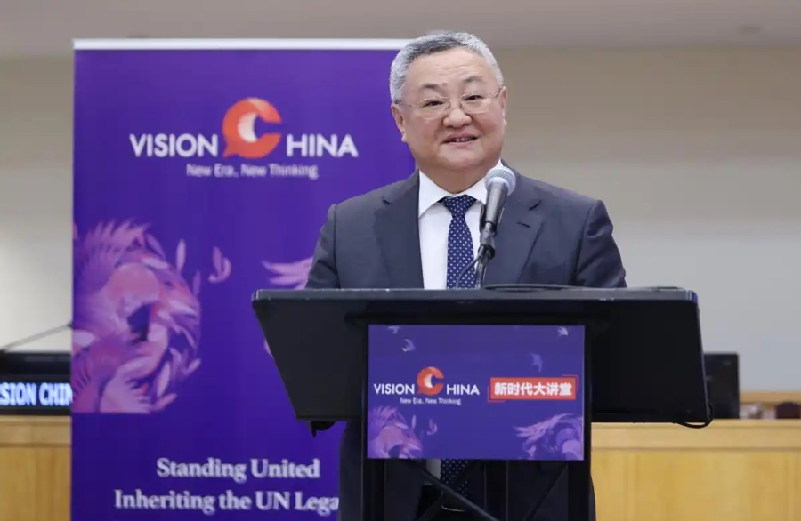 当地时间9月15日,纽约联合国总部的“新时代大讲堂”探讨全球治理倡议。图为中国常驻联合国代表、特命全权大使傅聪致辞。联合国副秘书长李军华,联合国南南合作办公室主任迪玛·哈提卜,哥伦比亚大学可持续发展中心主任、教授杰弗里·萨克斯,新加坡学者马凯硕,美国飞虎队创始人陈纳德将军外孙女、陈纳德飞行学院院长嘉兰惠,摩洛哥、尼加拉瓜、巴基斯坦、卡塔尔、俄罗斯常驻联合国代表团外交官作分享交流。图源中国日报社